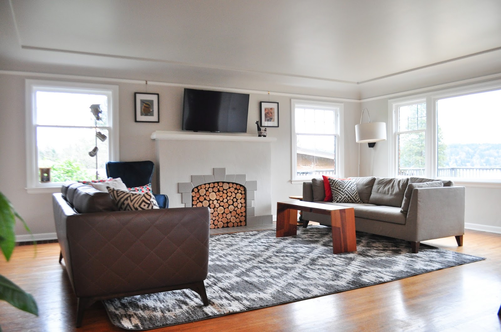 We did a little makeover. We brought the tv room couch upstairs and got a close-out leather couch from Macy's. We also got a new rug...which is a lot more white than I thought. One glass of spilled red wine is going to be the death of it.